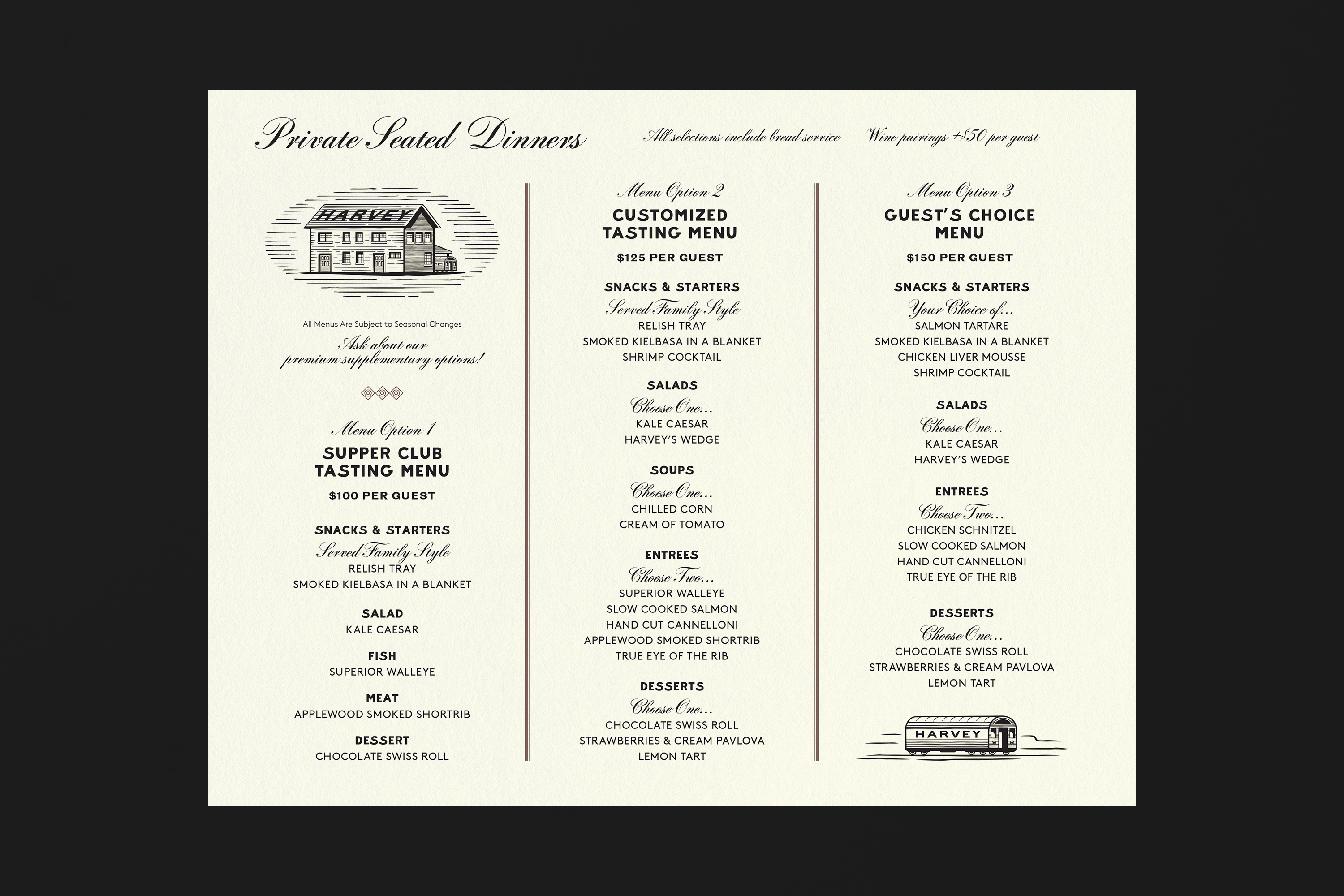 The Harvey House is a Midwestern restaurant in Wisconsin, inspired by the golden era of train travel and the post-Prohibition boom of Midwest supper clubs. The concept evokes nostalgia while offering a modern dining experience that invites guests to “choose their own adventure.”