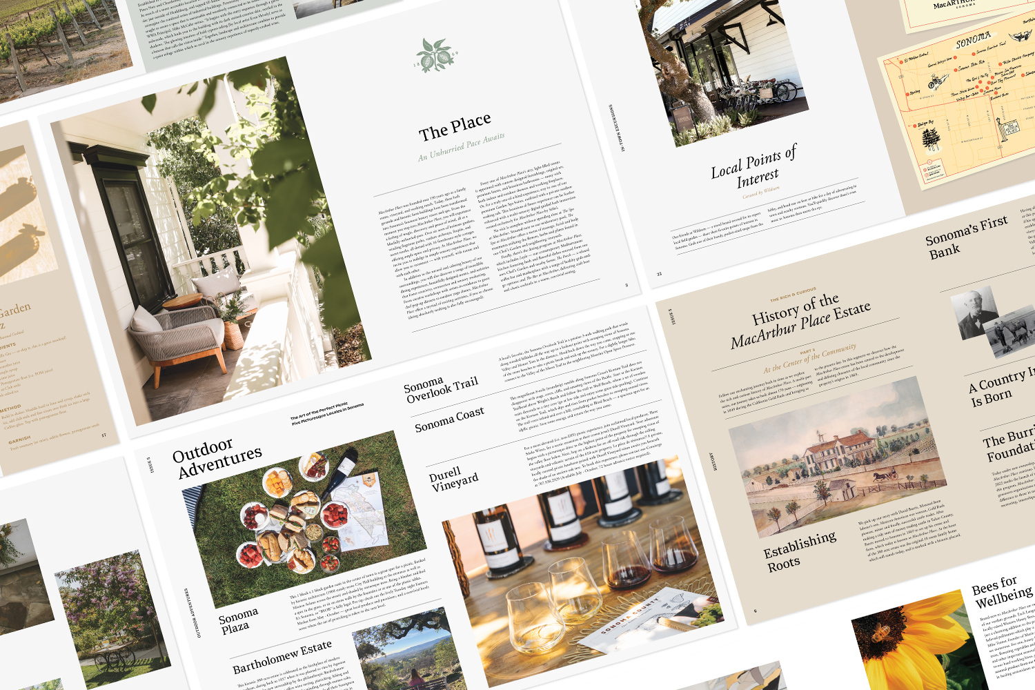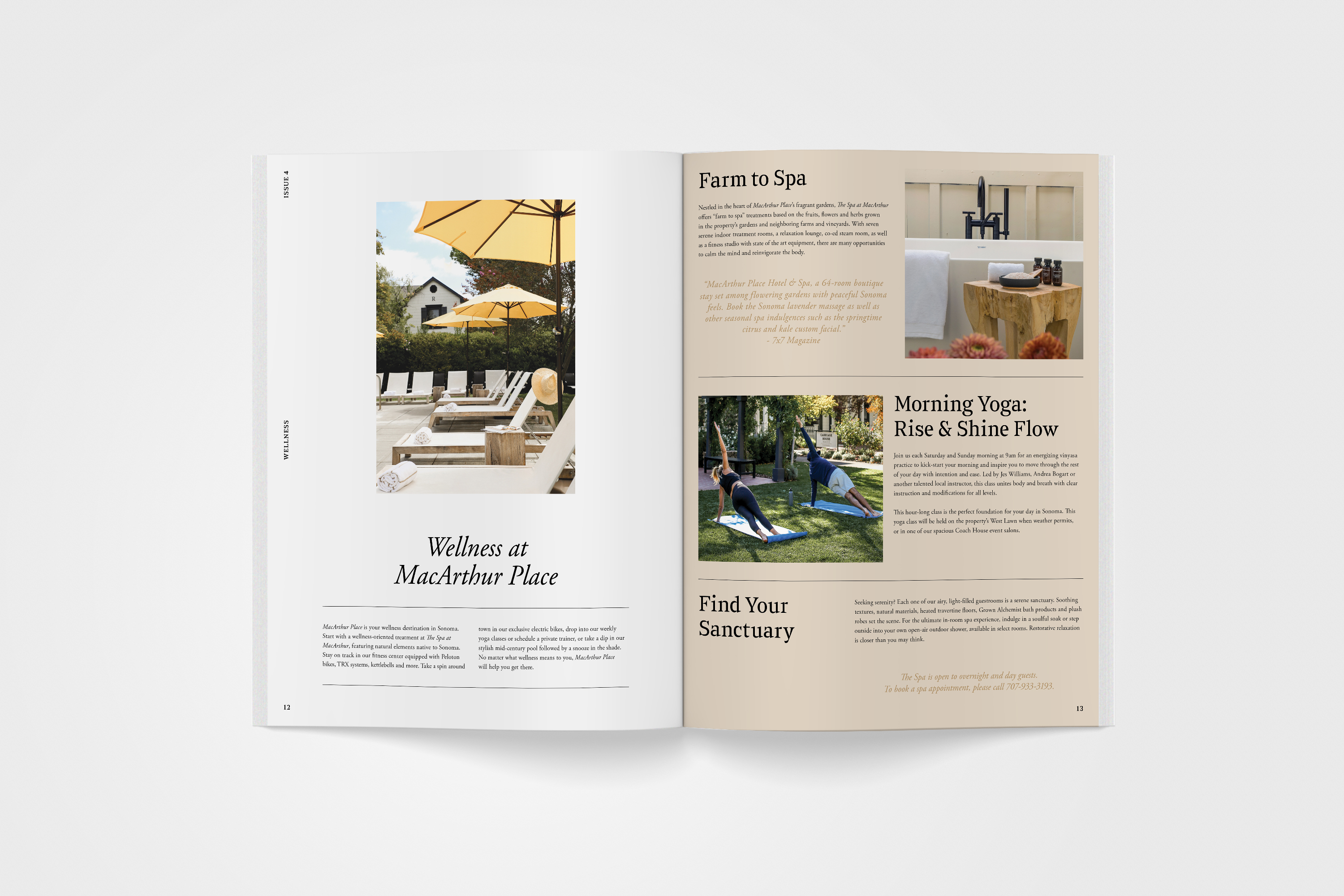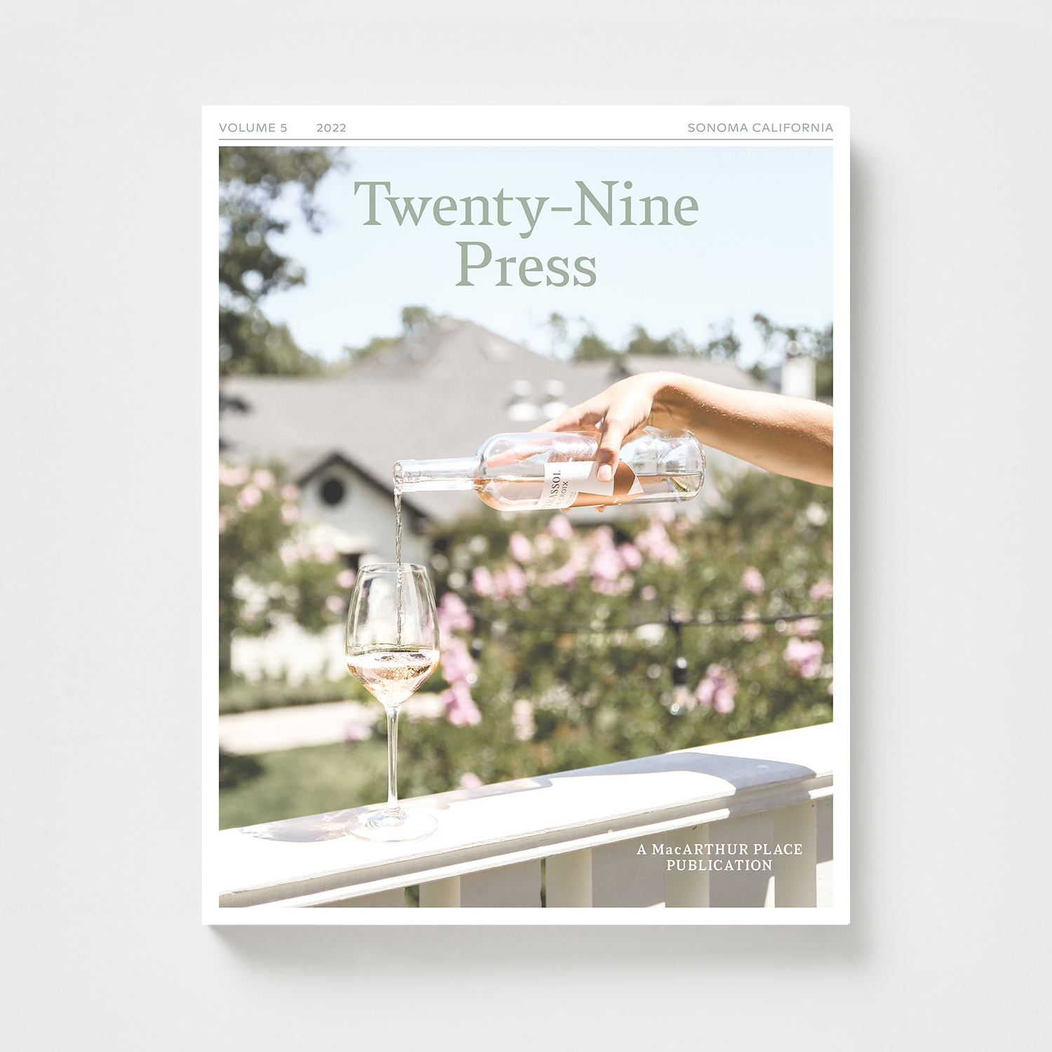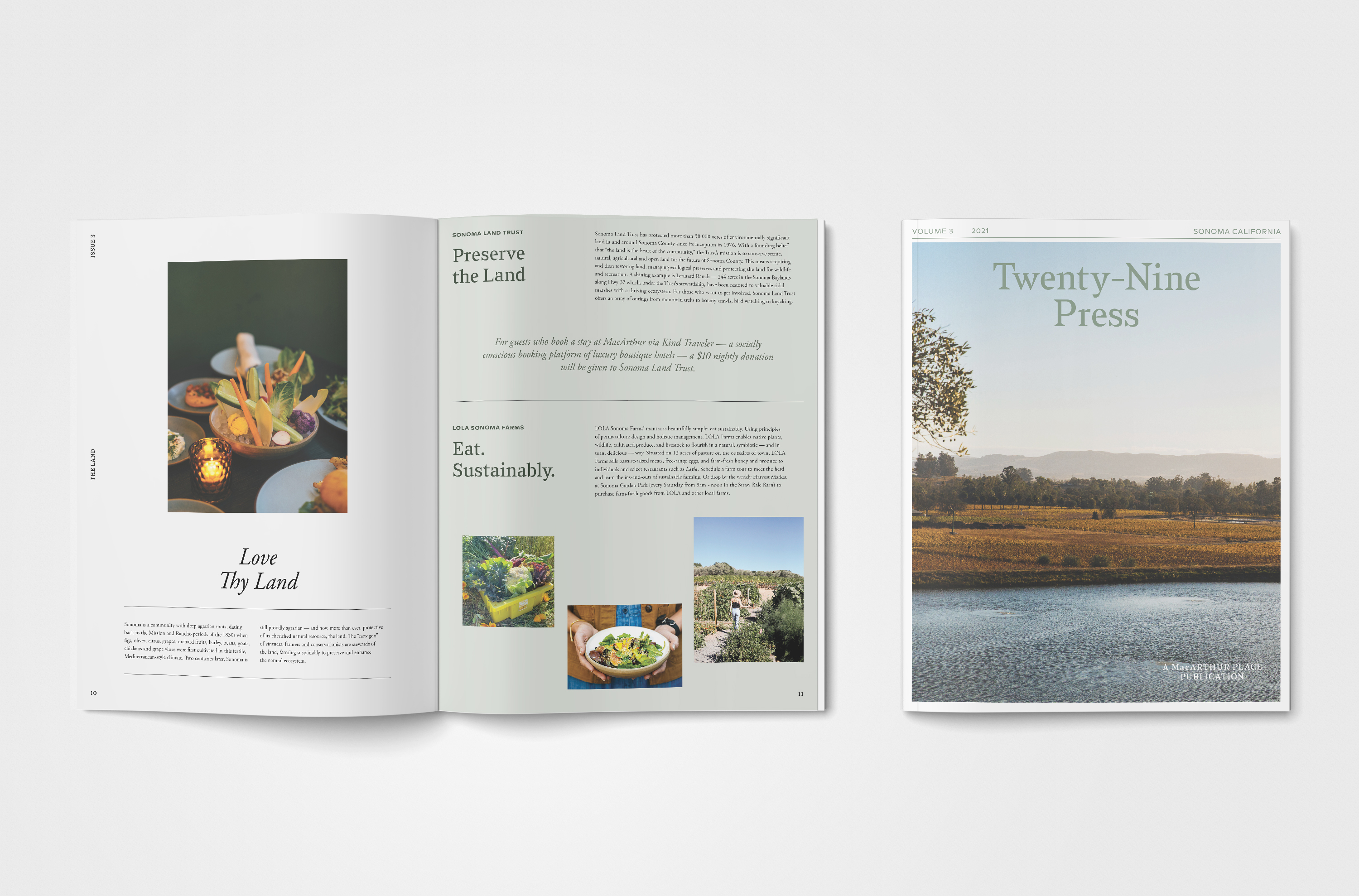 Twenty-Nine Press is the quarterly in-room publication of MacArthur Place, a luxury hotel and spa in Sonoma, CA. Designed as both a guide and a keepsake, the magazine introduces guests to the property’s offerings while spotlighting the surrounding community.