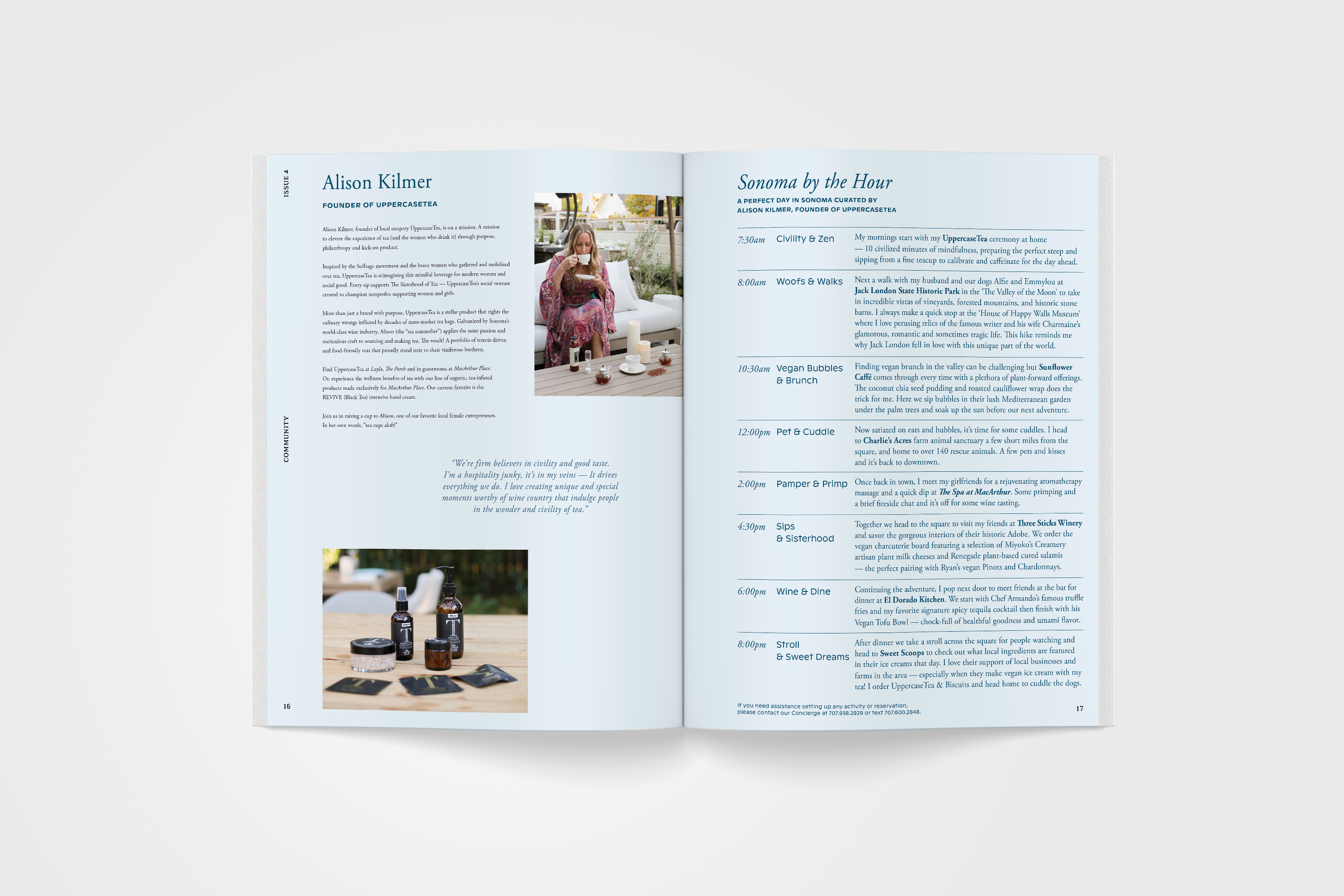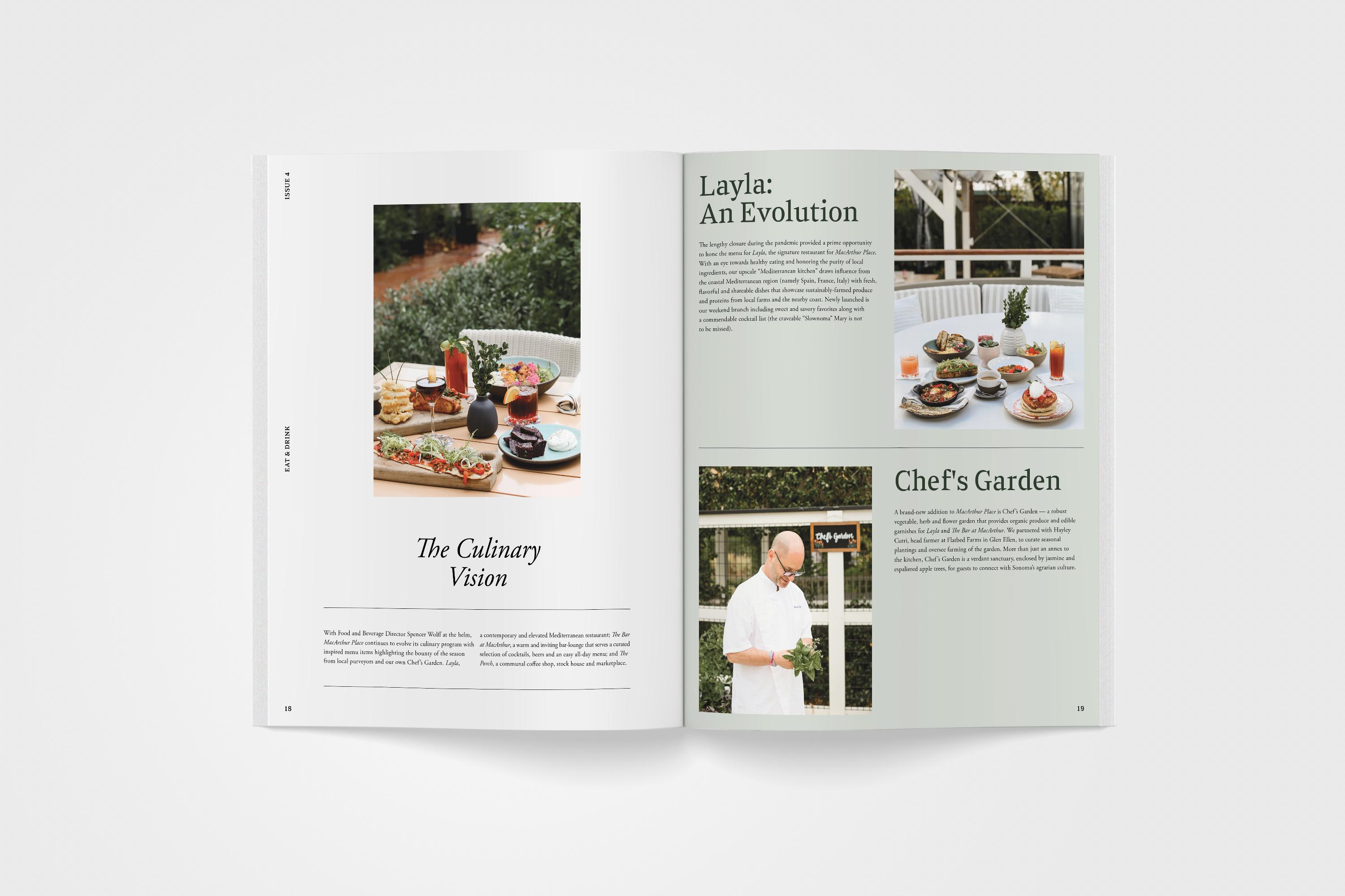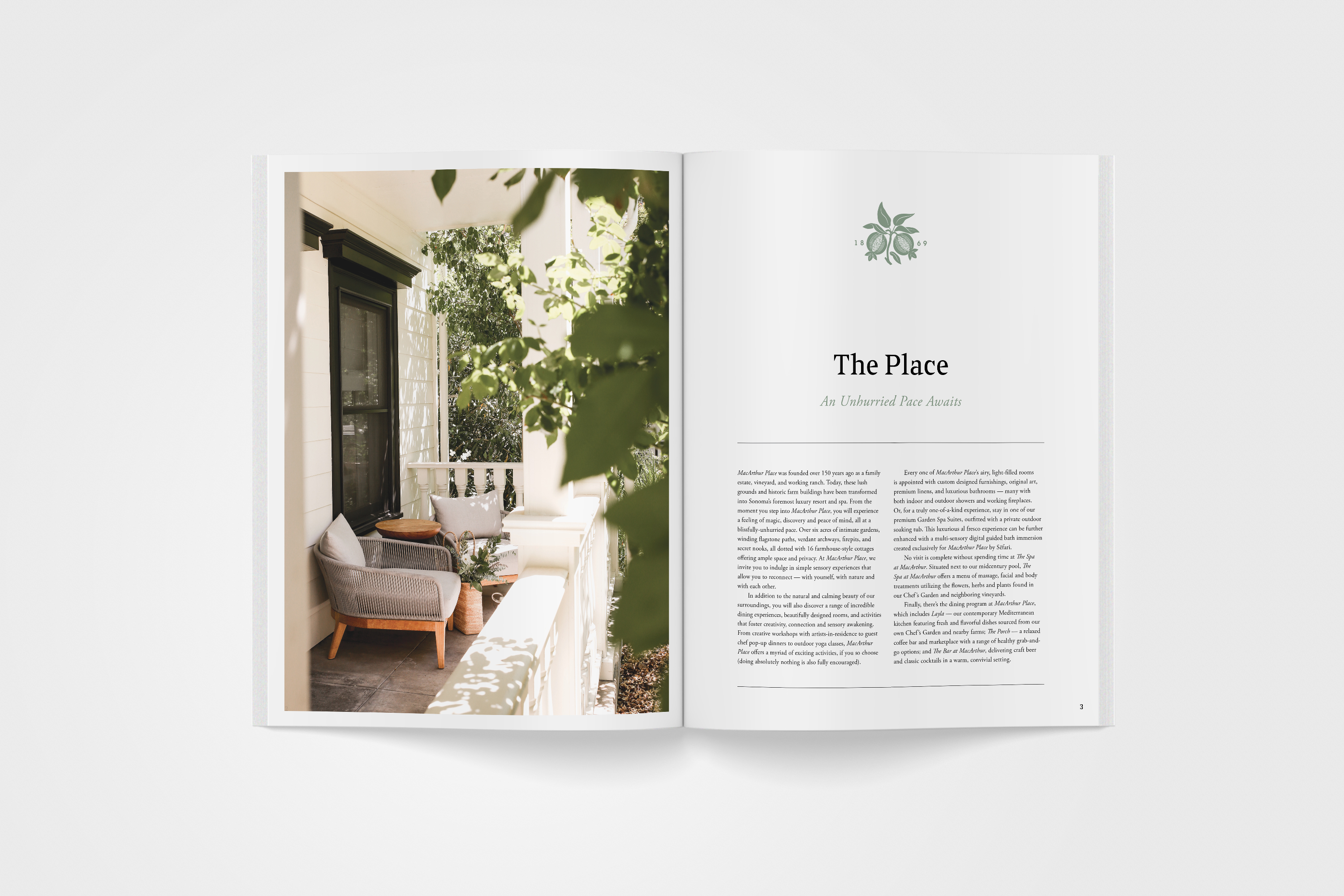 Twenty-Nine Press is the quarterly in-room publication of MacArthur Place, a luxury hotel and spa in Sonoma, CA. Designed as both a guide and a keepsake, the magazine introduces guests to the property’s offerings while spotlighting the surrounding community.