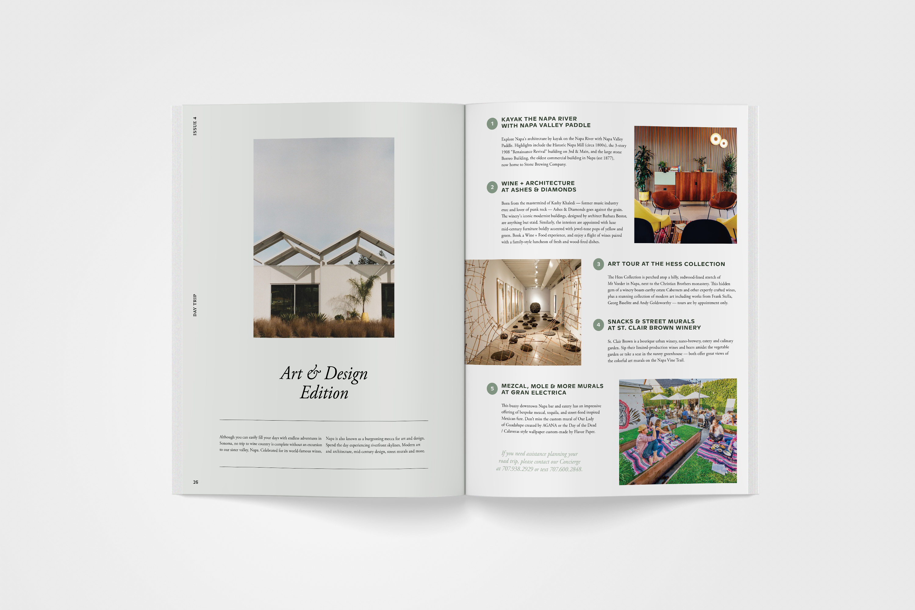 Each issue highlights local restaurants, wineries, and cultural experiences, blending editorial storytelling with refined design. The result is a publication that not only informs but also enhances the guest experience, reflecting the hotel’s commitment to hospitality and a sense of place.